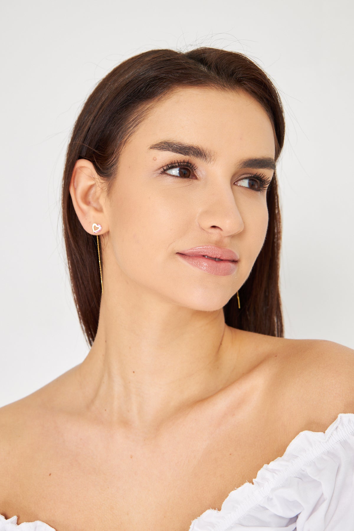 Add charm and elegance to your look with this gold threader earring, featuring a delicate open-heart design accented with sparkling pink gemstones. The fine gold chain offers a lightweight and comfortable fit, making it ideal for both everyday wear and special occasions.